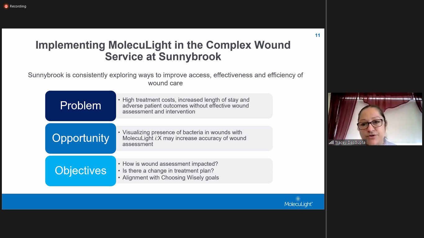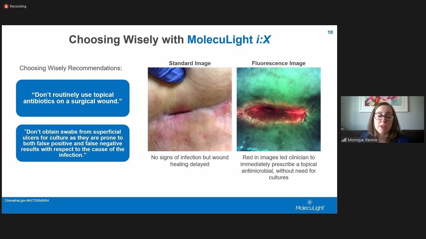 Use of the MolecuLight i:X to image for bacterial fluorescence, in conjunction with clinical signs & symptoms, adds an additional bacterial-specific piece of information that can be captured and considered in real-time.