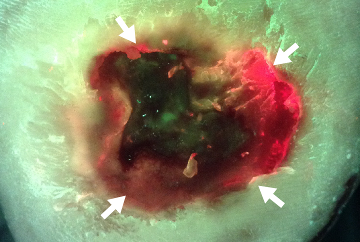 July 14, 2018 -Figure 2: FL-image FL-image revealed significant bioburden (red fluorescence) after debridement Read More