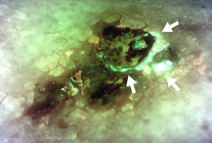 July 14, 2018 -Figure 2: FL-image Arrows indicate regions of cyan fluorescence Swabs of cyan regions later confirmed to be moderate growth of P. aeruginosa Read More